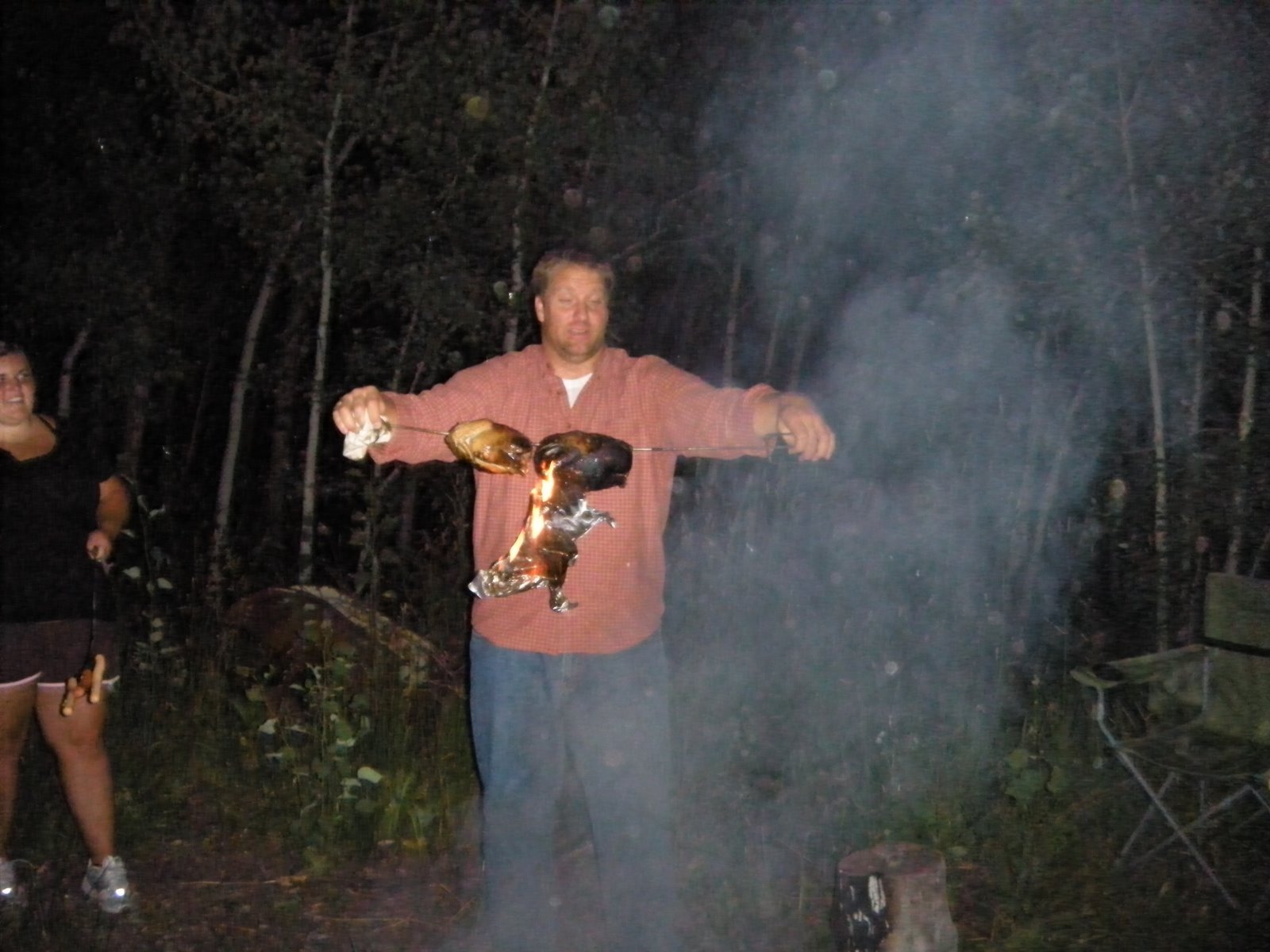 Danny had gotten 2 of his chickens processed and we tried cooking them over the fire. He didn't defrost them beforehand sooo it didn't really work. They were fried on the outside but still frozen on the inside.. funny Danny!